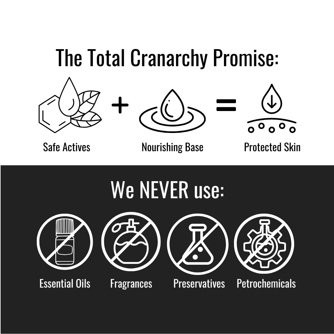 Total Cranarchy is our most powerful defensive product. We added science-backed antimicrobial extracts to a rich base of vitamin-rich plant oils. Broad-spectrum fatty acids feed the skin's protective microbiome and restore the deeper layers. We intentionally chose antifungal actives that not only protect the skin, but also banish redness and improve skin health.